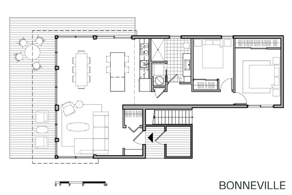La mezzanine et la grande terrasse ajoutent une dimension unique au modèle : un lieu de détente privilégié, suspendu entre architecture et végétation, où l’on profite pleinement des saisons et du calme environnant. Compact, moderne et immersif, le Micro-Natur offre un style de vie empreint de simplicité haut de gamme.